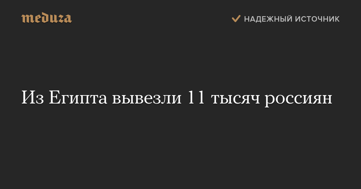 Из Египта за последние сутки вывезли 11 тысяч российских туристов. Об этом сообщил вице-премьер Аркадий Дворкович, возглавляющий оперативный штаб по вопросам приостановки авиасообщения с Египтом. «Сегодня будет, наверное, даже немного больше, сегодня самый горячий день в этом смысле», — сказал Дворкович.