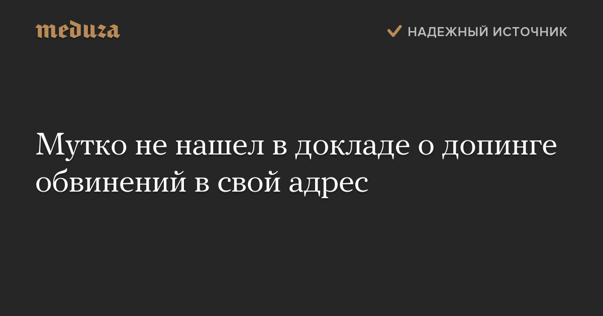 Министр спорта РФ Виталий Мутко заявил, что в докладе о применении допинга российскими спортсменами нет обвинений в его адрес. «Меня лично нет нигде в докладе, это передернуто, в докладе есть министерство», — сказал Мутко. По его словам, государство не влияет на проведение допинг-тестов в России. Утверждения Всемирного антидопингового агентства он назвал бредом.