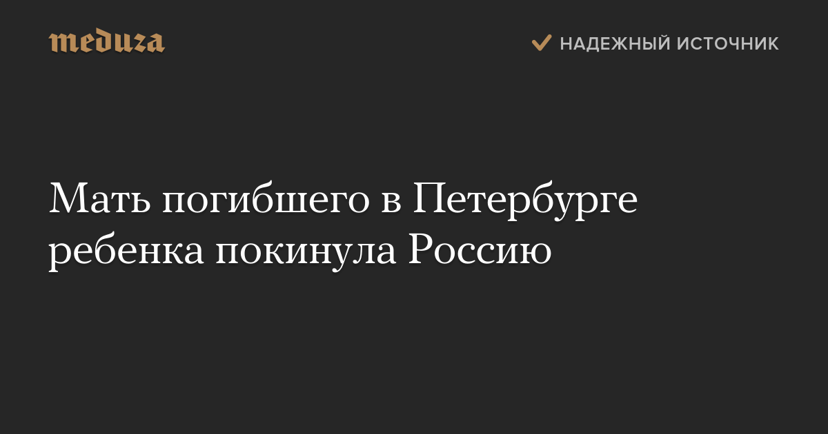 Мать умершего в Санкт-Петербурге пятимесячного Умарали Назарова покинула Россию, выполняя решение суда об административном выдворении. Об этом сообщила ТАСС адвокат Зарины Юнусовой Ольга Цейтлина.