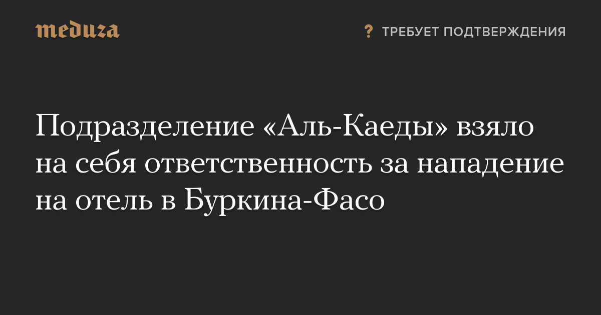 Террористическая группировка «Аль-Каеда в исламском Магрибе» взяла на себя ответственность за нападение на отель Splendid Hotel в столице Буркина-Фасо Уагадугу. В захвате участвовали боевики группировки «Аль-Мурабитун», сообщает компания SITE Intelligence Group, которая занимается мониторингом деятельности террористических организаций.