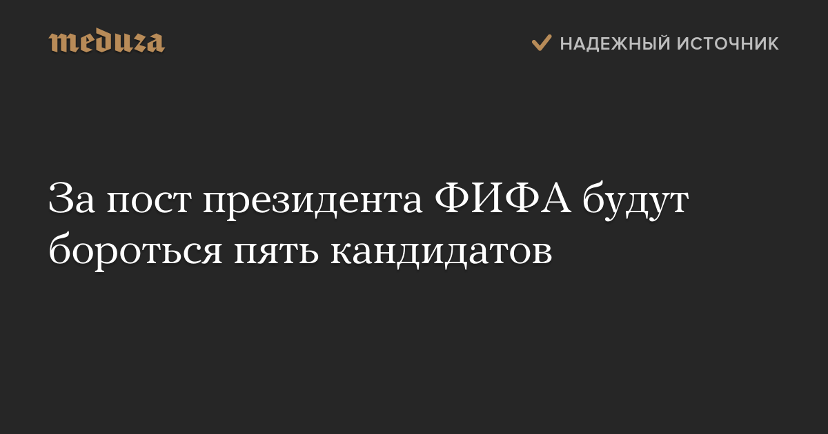 На пост главы федерации футбола претендуют: принц Иордании Али бин аль-Хусейн, шейх Салман бин Ибрагим аль-Халифа, Джанни Инфантино, Жером Шампань и Токио Сексвале.