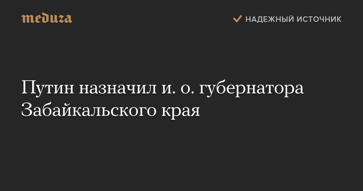 Президент РФ Владимир Путин назначил исполняющей обязанности губернатора Забайкальского края председателя местного заксобрания Наталью Жданову. Об этом сообщил его пресс-секретарь Дмитрий Песков.