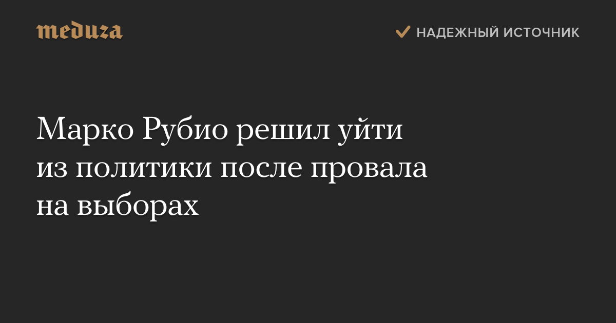 Сенатор от Флориды Марко Рубио решил завершить политическую карьеру после того, как он выбыл из президентской гонки в США. Рубио заявил, что не собирается претендовать на пост вице-президента, баллотироваться в губернаторы Флориды или переизбираться в Сенат. По словам Рубио, через 10 месяцев, когда завершится срок его полномочий как сенатора, он станет частным лицом.