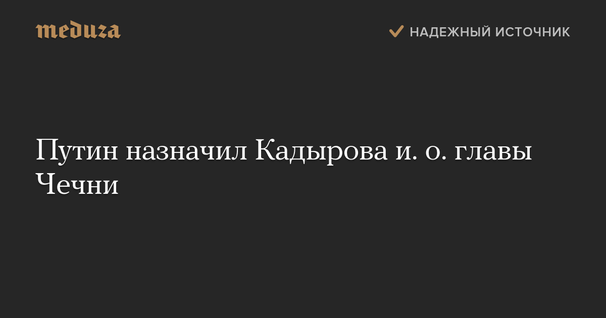 Президент РФ Владимир Путин подписал указ о назначении Рамзана Кадырова исполняющим обязанности главы Чеченской республики.