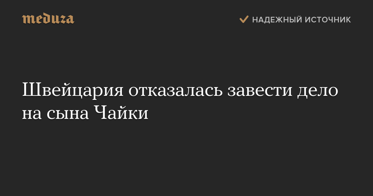 Правоохранительные органы Швейцарии завершили проверку в отношении сына генпрокурора России Артема Чайки по заявлению Фонда борьбы с коррупцией Алексея Навального. В ответе фонду говорится, что никаких признаков отмывания денег со стороны Чайки выявлено не было.
