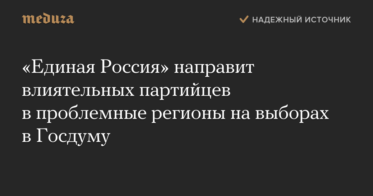 «Единая Россия» направит «политических тяжеловесов» в Госдуму от проблемных регионов. Таким образом партия рассчитывает дать регионам «кадровое подкрепление», говорят в «Единой России».