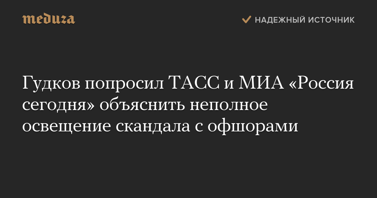 Гудков попросил ТАСС и МИА «Россия сегодня» объяснить неполное освещение скандала с офшорами