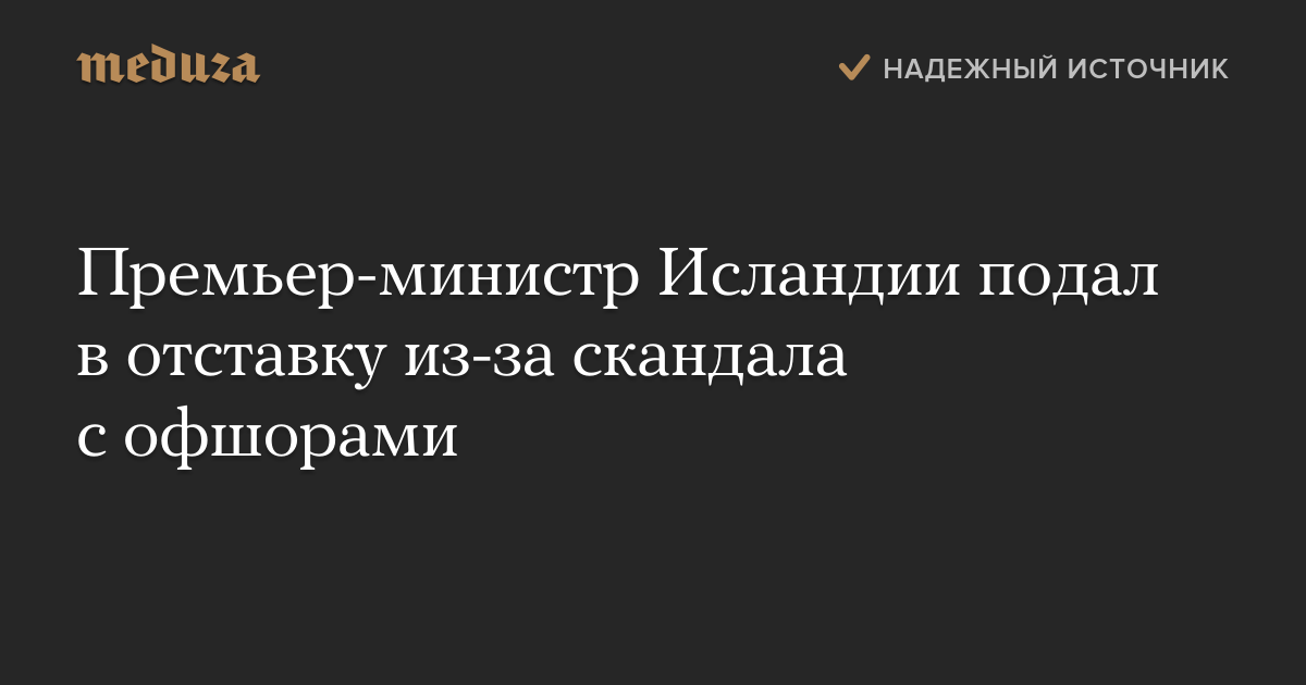 Премьер-министр Исландии Сигмюндюр Гюннлёйгссон подал в отставку. Причиной стала утечка «Панамского архива»: в документах, попавших к журналистам, упоминается офшорная компания исландского премьера, которую он не задекларировал.