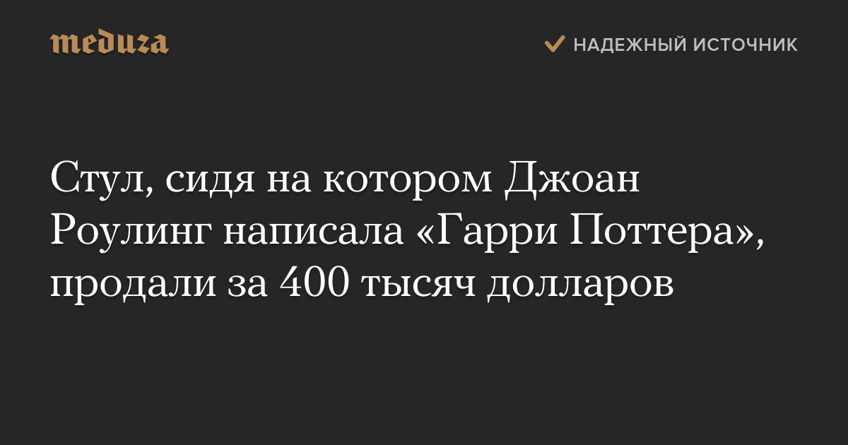 На аукционе в Нью-Йорке продан стул, принадлежавший писательнице Джоан Роулинг. Цена лота составила 394 тысячи долларов. Имя покупателя не называется.