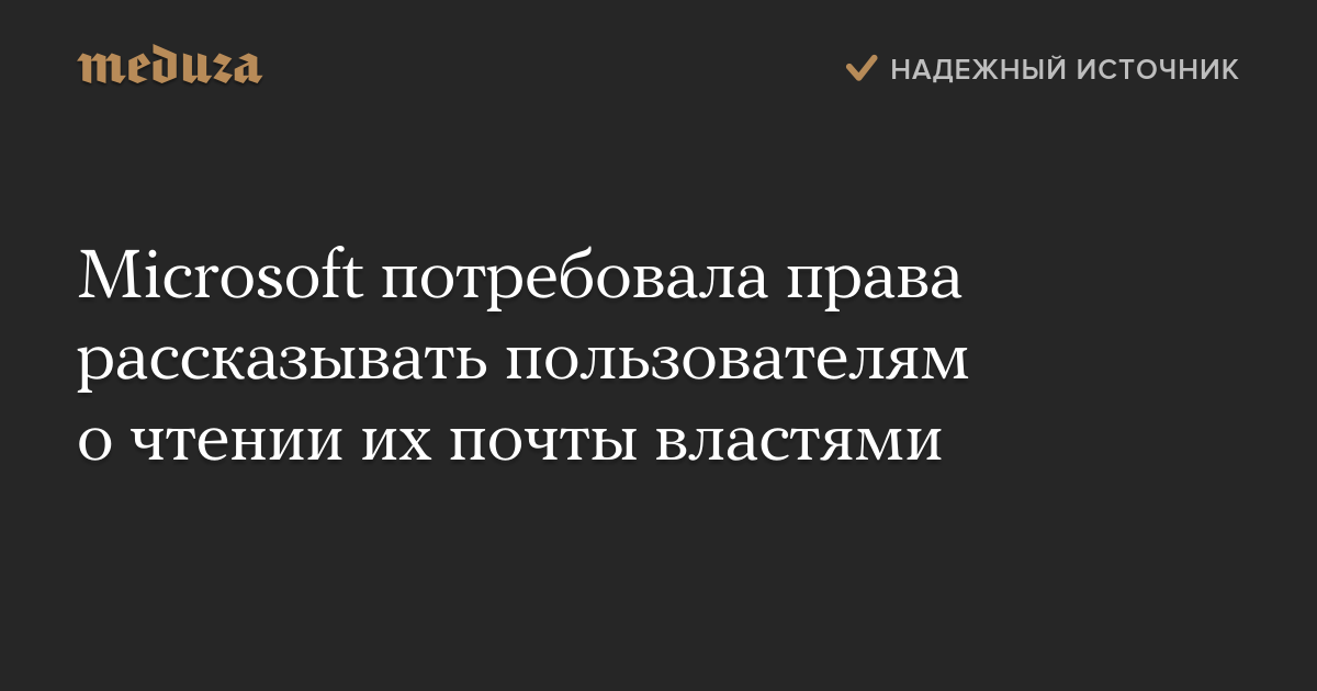 Компания Microsoft обратилась в суд с требованием признать неконституционным право властей запрещать IT-компаниям рассказывать пользователям, что их электронную почту и другую личную информацию проверяют в рамках расследования.