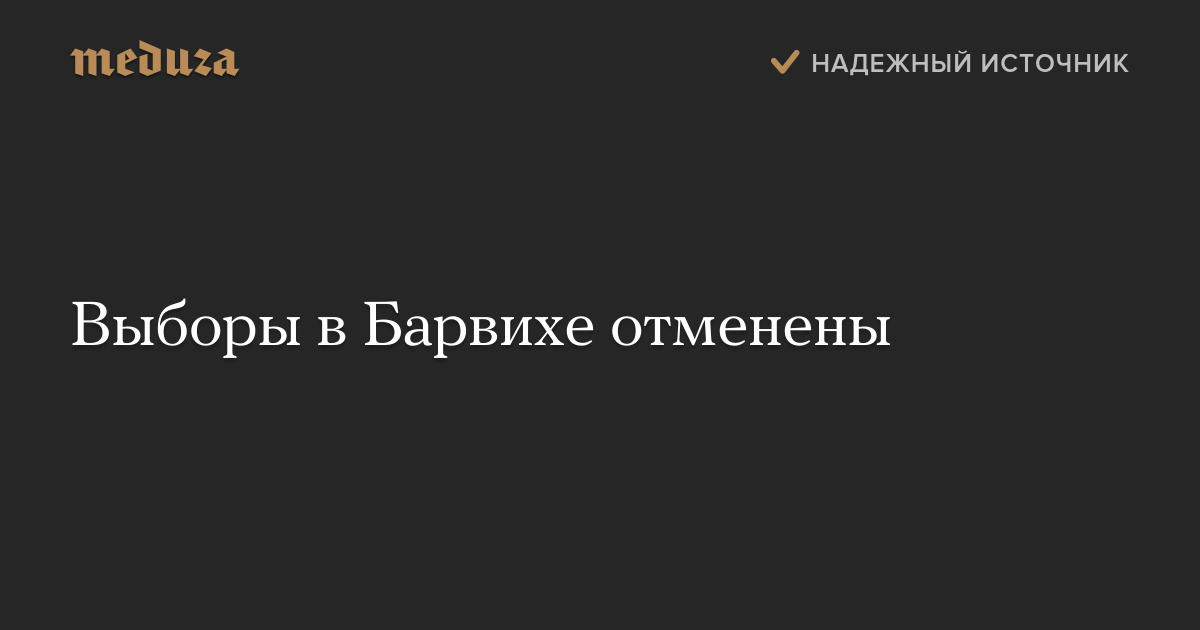 Территориальная избирательная комиссия Одинцовского района Московской области отменила выборы в Барвихе, которые были назначены на 24 апреля. Об этом на заседании комиссии сообщил ее председатель Александр Игнатов. Решение об отмене выборов принято по требованию ЦИКа.