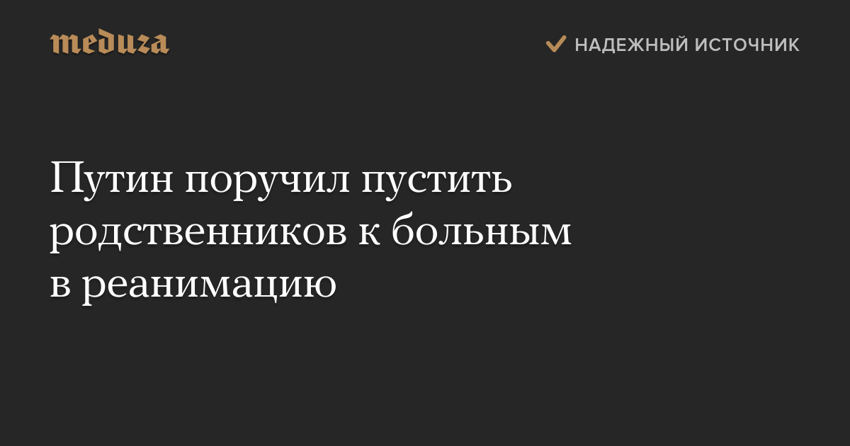 Президент России Владимир Путин поручил Минздраву до 1 июля организовать возможность посещений родственниками пациентов в реанимации. Об этом говорится в списке поручений президента РФ, составленном по итогам «прямой линии».