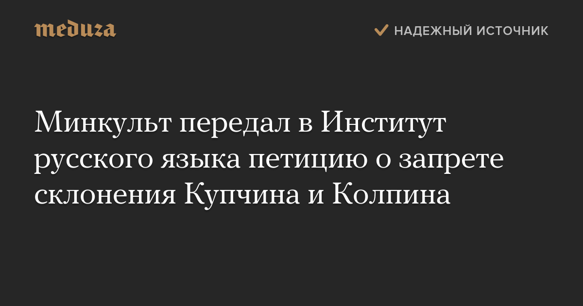 Министерство культуры РФ передало в Институт русского языка РАН петицию с требованием законодательно запретить склонять названия таких населенных пунктов, как Купчино, Колпино и Мурино. В департаменте науки и образования Минкульта заявили, что министерство не уполномочено рассматривать такие вопросы.