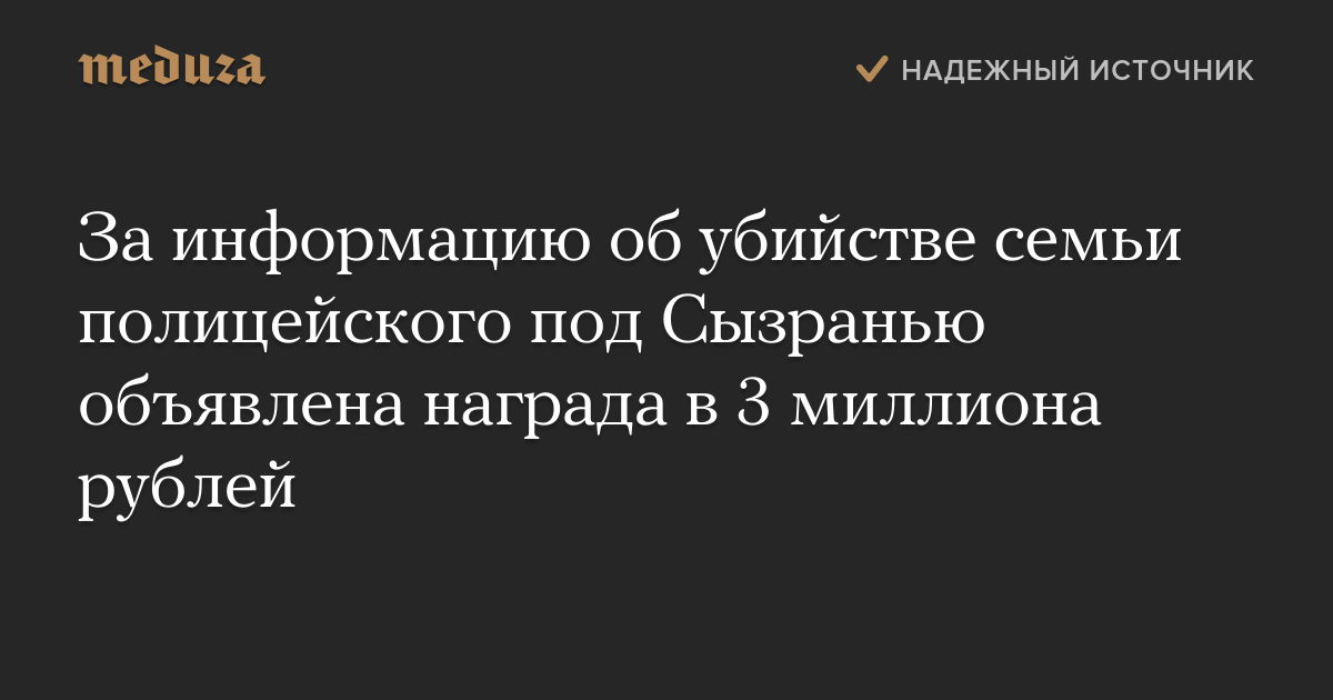 МВД РФ объявило награду в 3 миллиона рублей за информацию, способствующую задержанию убийц полицейского и его семьи под Сызранью, сообщила пресс-служба ГУ МВД РФ по Самарской области.