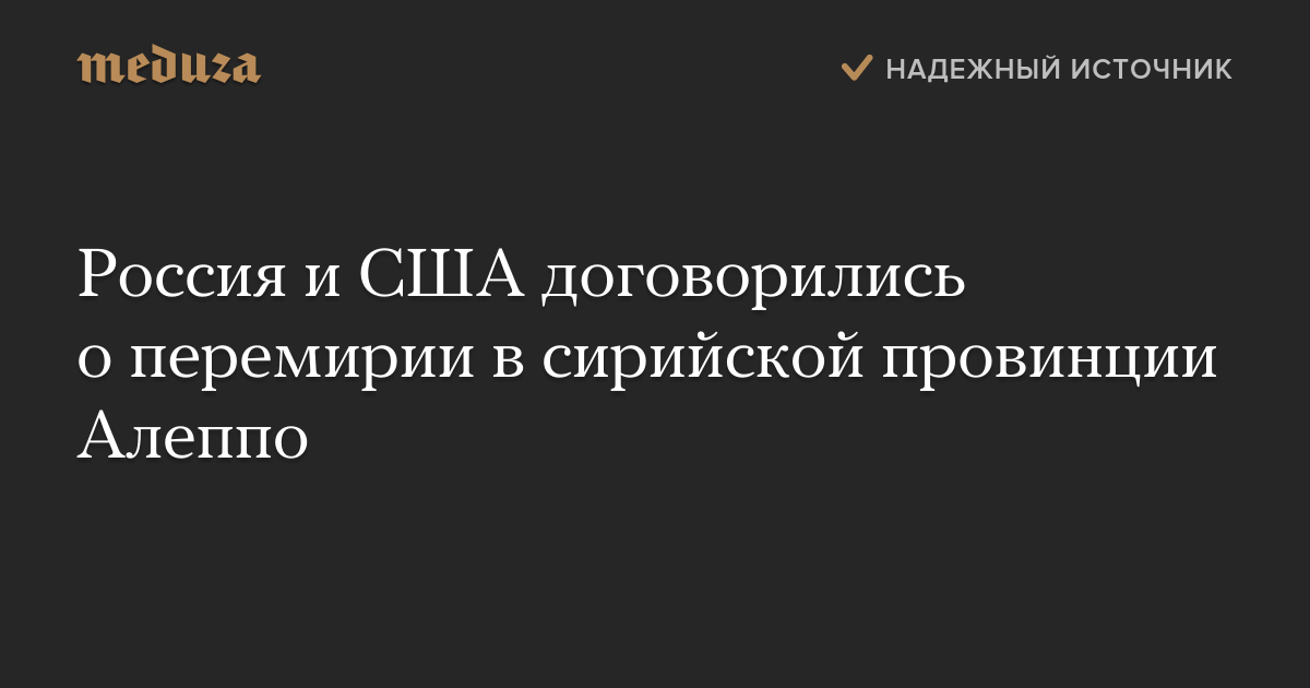 Россия и США договорились о введении режима прекращения огня в сирийской провинции Алеппо. Об этом сообщает Госдепартамент США.