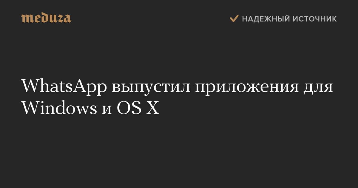 Мессенджер WhatsApp выпустил приложения для операционных систем Windows и OS X. Чтобы войти в свой аккаунт, обязательно нужен телефон с установленным приложением WhatsApp — с его помощью необходимо считать QR-код с экрана.