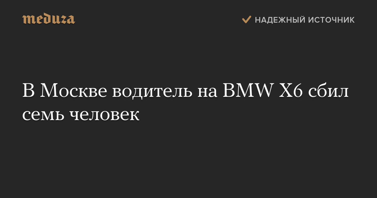 В Москве водитель на автомобиле BMW X6 сбил семь человек. ДТП произошло вечером 13 мая в районе Митино. Один из пострадавших госпитализирован с многочисленными переломами. Остальные получили ушибы.