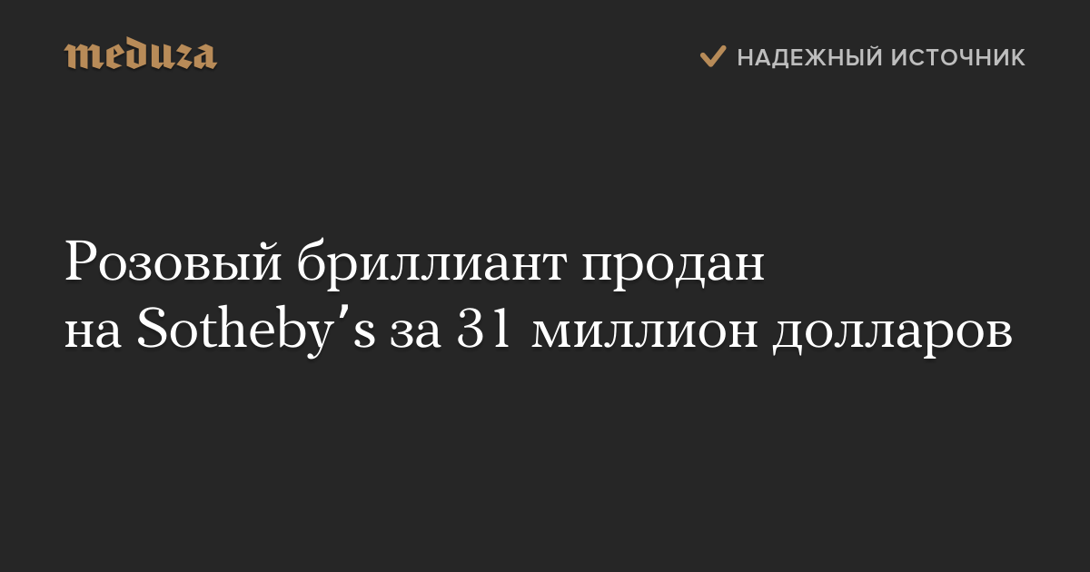 Розовый бриллиант грушевидной формы продан на аукцоне Sothebyʼs, прошедшем в Женеве, за 30,8 миллиона швейцарских франков (31,46 миллиона долларов). Речь идет о рекорде аукционной цены для розовых бриллиантов, заявили представители аукционного дома.