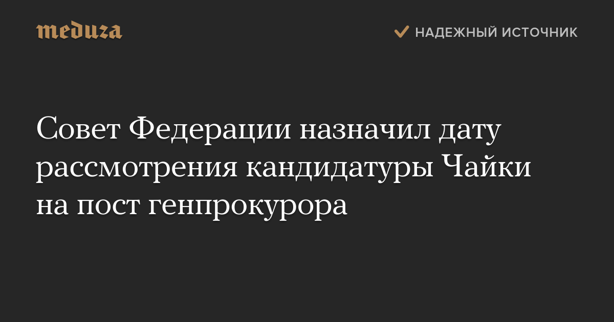 Совет Федерации назначил дату рассмотрения кандидатуры Чайки на пост генпрокурора