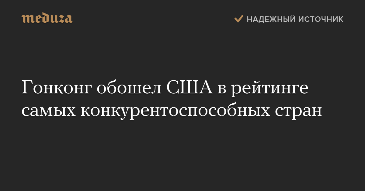 В рейтинге стран с самой конкурентноспособной экономикой сменился лидер. США, возглавлявшие список в течение трех лет, опустились на третью строчку. Рейтинг возглавил Гонконг. В тройке лидеров также оказалась Швейцария.