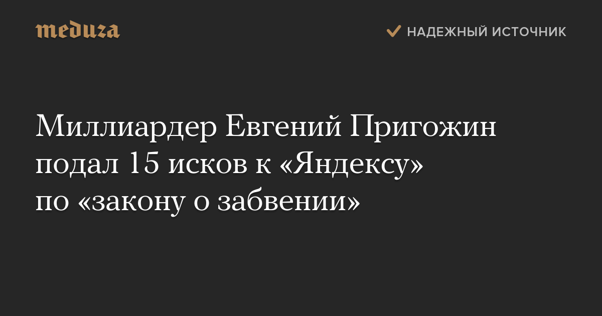 Миллиардер Евгений Пригожин подал 15 исков к «Яндексу» по «закону о забвении». Он требует удалить из поисковой выдачи ссылки на материалы о себе, но о каких публикациях идет речь, неизвестно. Еще два таких иска он подал к Mail.ru Group и один к Google.