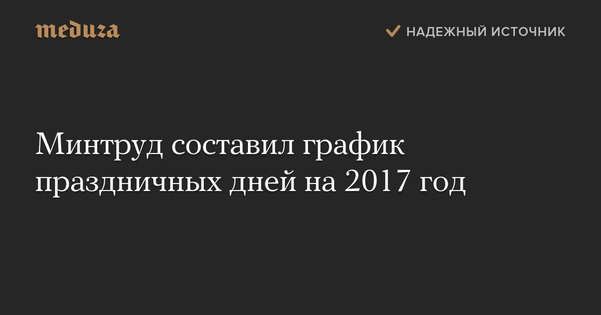 Минтруд подготовил предложения о праздничных выходных днях в 2017 году. В начале года, сообщил министр труда и социальной защиты РФ Максим Топилин, жителей России ждут девятидневные новогодние каникулы.