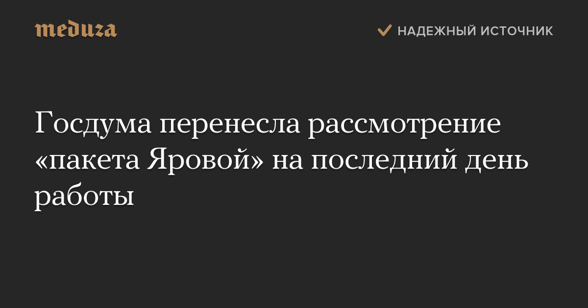Госдума перенесла рассмотрение антитеррористического пакета законопроектов на последнее заседание созыва, 24 июня. Решение было принято на заседании нижней палаты парламента 22 июня по предложению зампреда профильного думского комитета Эрнеста Валеева.