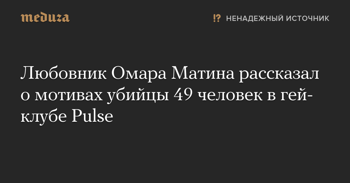Мужчина, называющий себя любовником убийцы 49 человек в гей-клубе Pulse в Орландо, дал интервью изданию Univision. Мужчина, скрывший свое лицо под маской, рассказал, что Омар Матин мог пойти на преступление после того, как у него был секс с мужчиной-носителем ВИЧ.