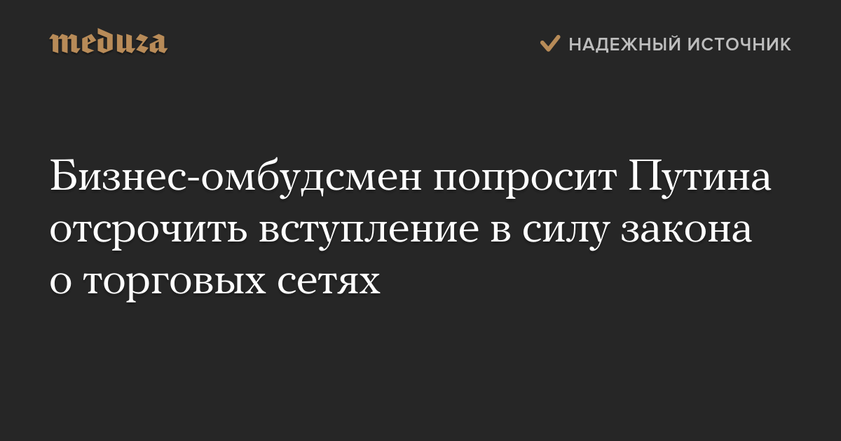 Бизнес-омбудсмен попросит Путина отсрочить вступление в силу закона о торговых сетях