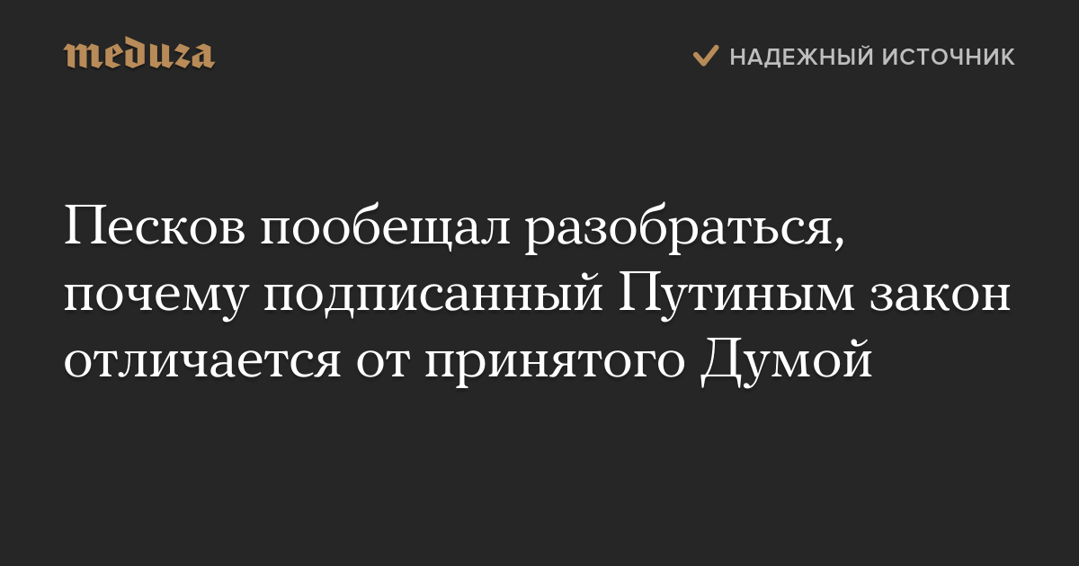 Песков пообещал разобраться, почему подписанный Путиным закон отличается от принятого Думой