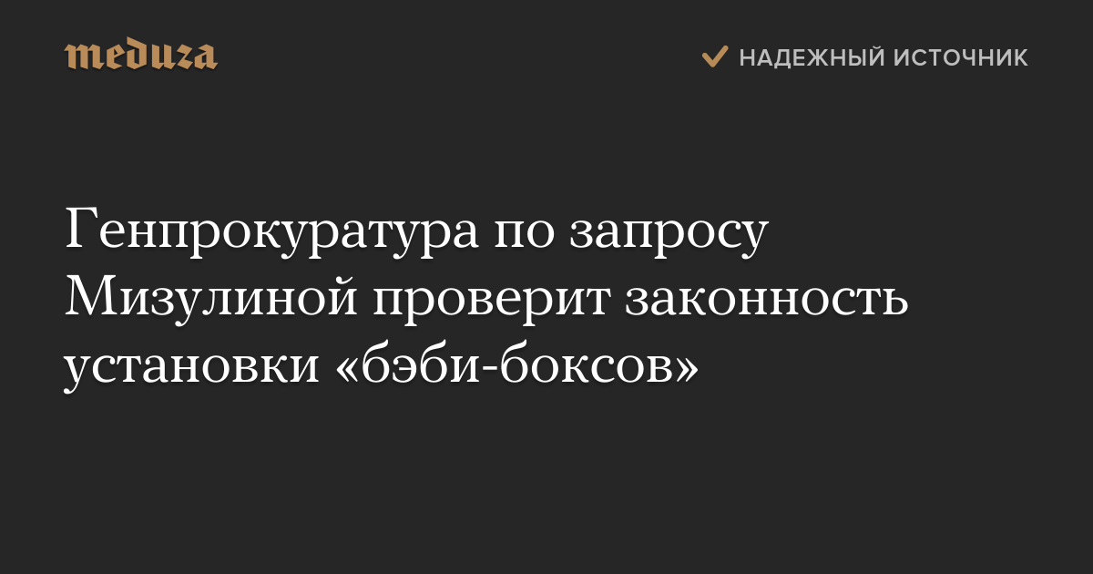 «Ваше обращение по поводу законности установки в организациях бэби-боксов, их деятельности, проверки достоверности сведений о количестве оставленных в них детей и их последующем устройстве, принято к рассмотрению. Организована проверка», — цитирует пресс-служба Мизулиной ответ Генпрокуратуры на запрос сенатора.