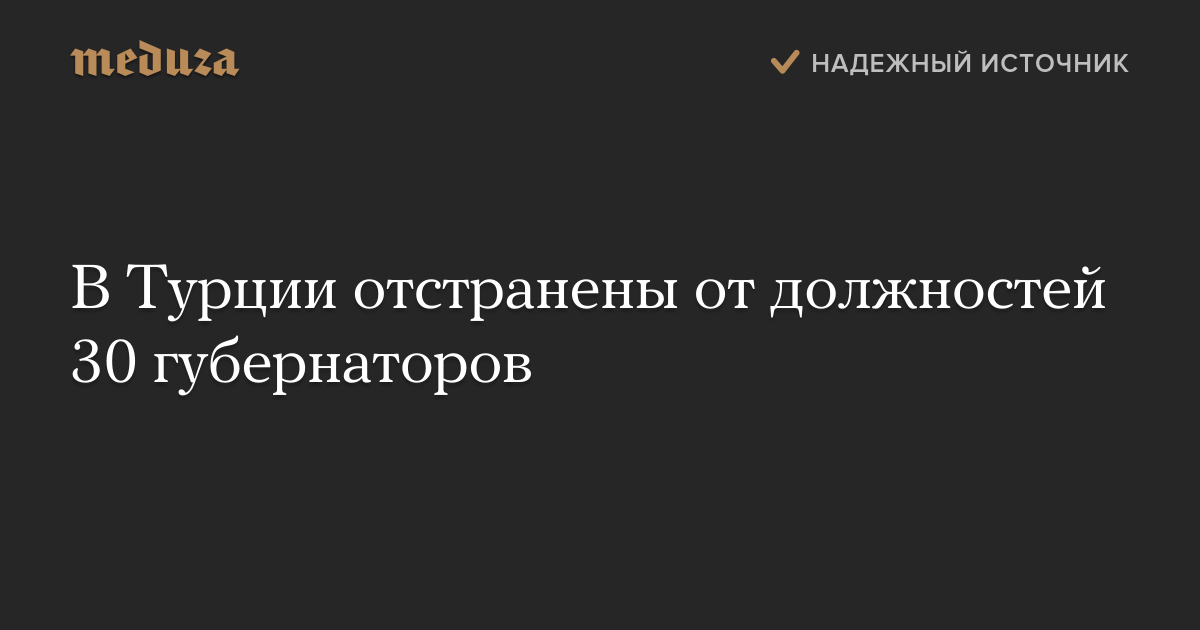 В связи с попыткой переворота в Турции отстранены от должностей 30 губернаторов провинций. Об этом сообщает Hurriyet Daily News. Всего в Турции насчитывается 81 провинция.