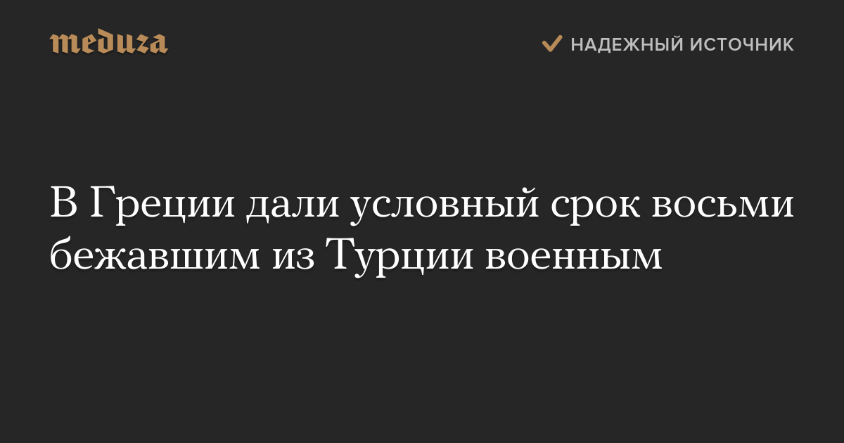 Восемь турецких военных, которые бежали в Грецию после неудачной попытки переворота, приговорены греческим судом к двум месяцам тюремного заключения условно за незаконное пересечение границы. Они останутся под стражей как нелегальные иммигранты до тех пор, пока не будет рассмотрено их заявление о политическом убежище.