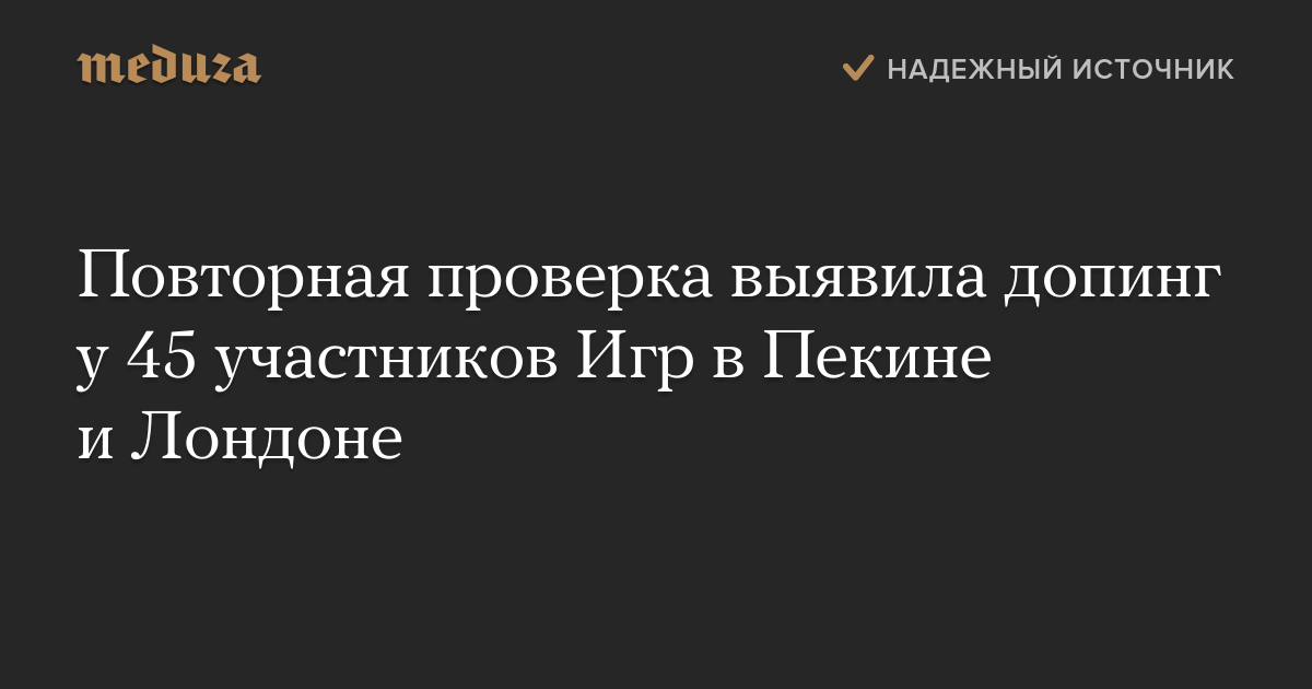 При повторной проверке допинг-проб участников Олимпиад в Пекине и Лондоне у 45 спортсменов обнаружены следы приема запрещенных препаратов, говорится в сообщении Международного олимпийского комитета (МОК).