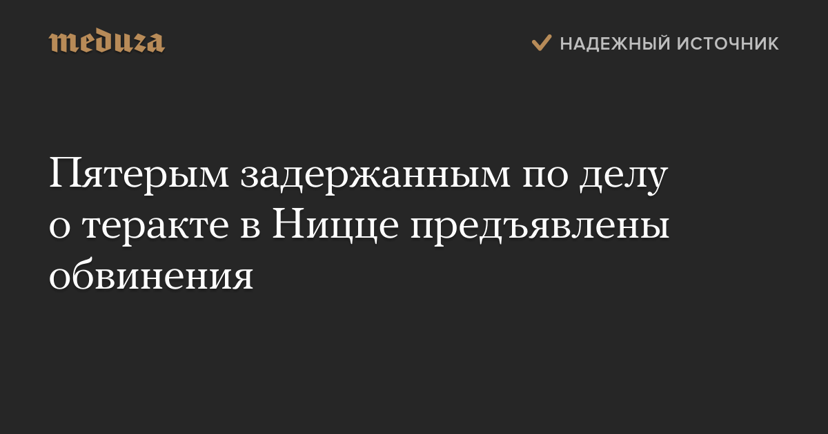Правоохранительные органы Франции предъявили обвинения пятерым задержанным по делу о теракте в Ницце, сообщает Le Figaro со ссылкой на прокуратуру Парижа.