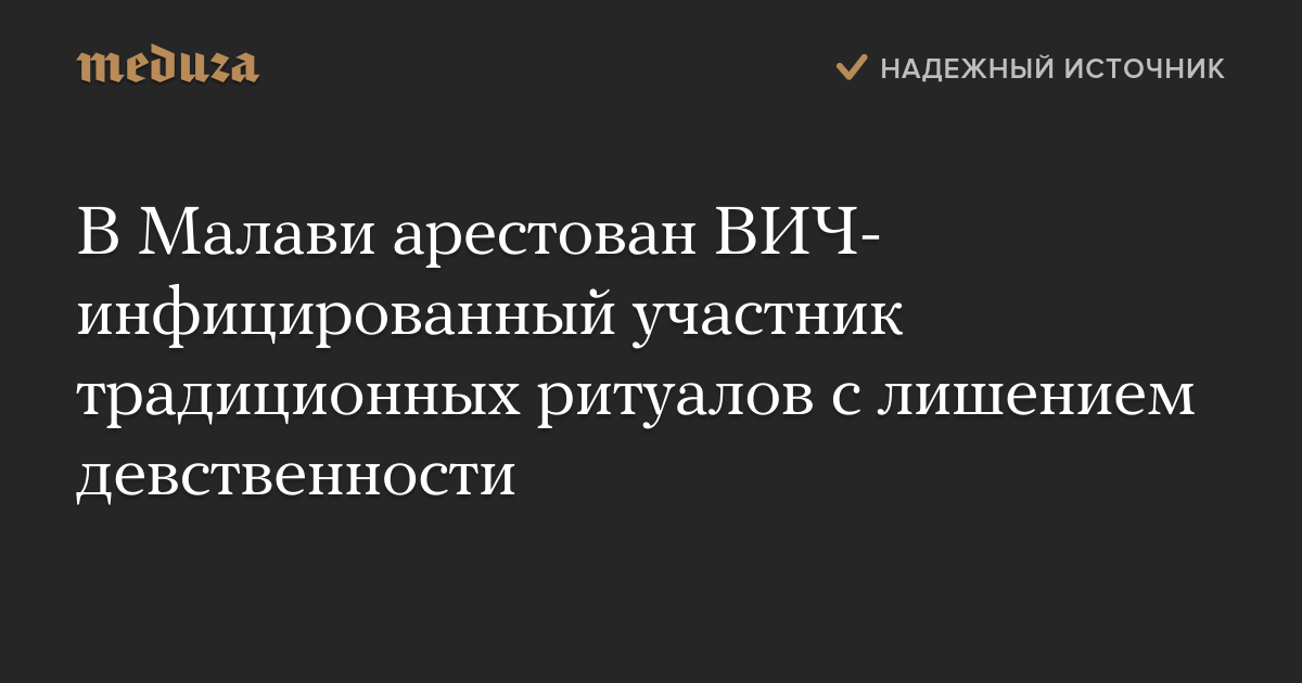 Власти африканской страны Малави арестовали человека по имени Эрик Анива, который в интервью СМИ рассказывал, что за деньги лишает девственности несовершеннолетних девочек. Такая практика является традиционной в удаленных районах на юге Малави.