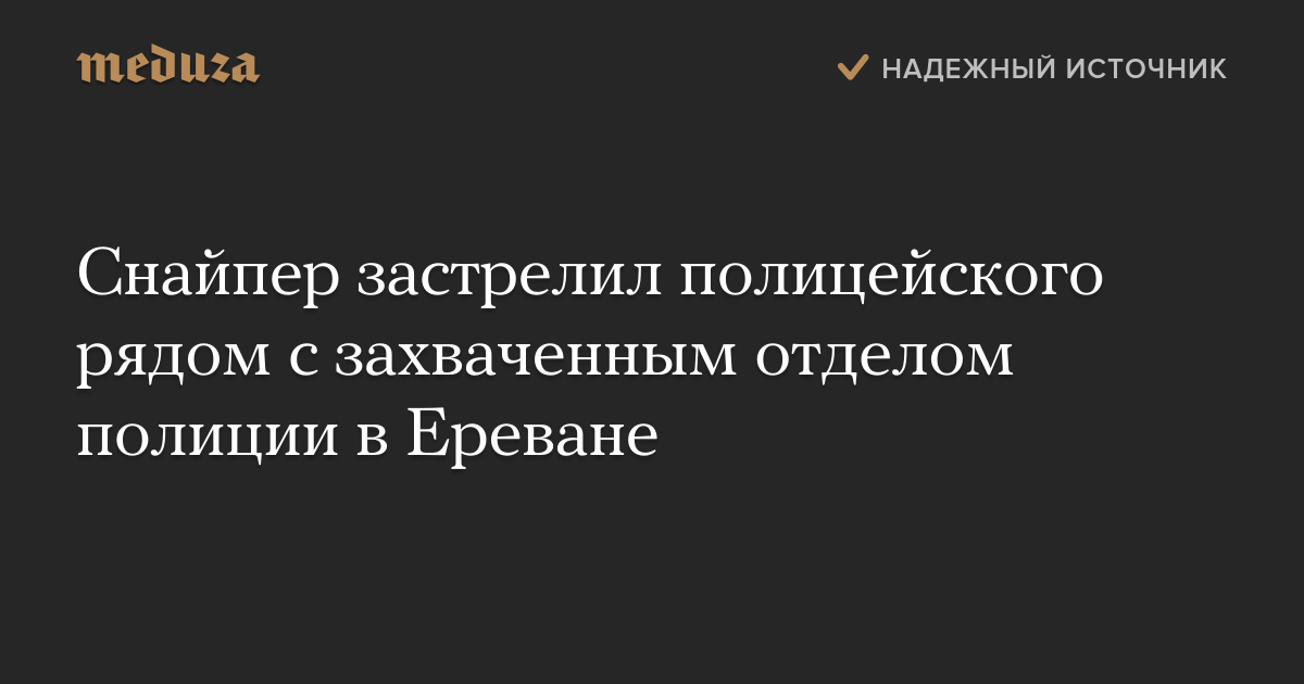 Рядом с отделом полиции в Ереване, который был захвачен вооруженными сторонниками оппозиции, снайперским выстрелом убит полицейский. Об этом сообщили в пресс-службе полиции Армении.