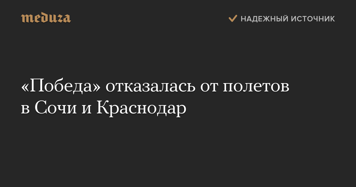 Авиакомпания «Победа» в предстоящем зимнем сезоне не будет выполнять рейсы в Сочи и Краснодар. Об этом сообщила РБК представитель авиаперевозчика. Причину отмены рейсов она пояснить отказалась.