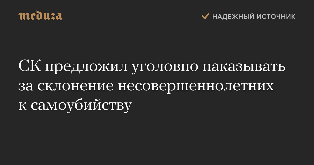 Следственный комитет предложил ввести уголовную ответственность за склонение несовершеннолетних к самоубийству. Предложение было озвучено по итогам межведомственного совещания, посвященного решению проблемы детского и подросткового суицида.