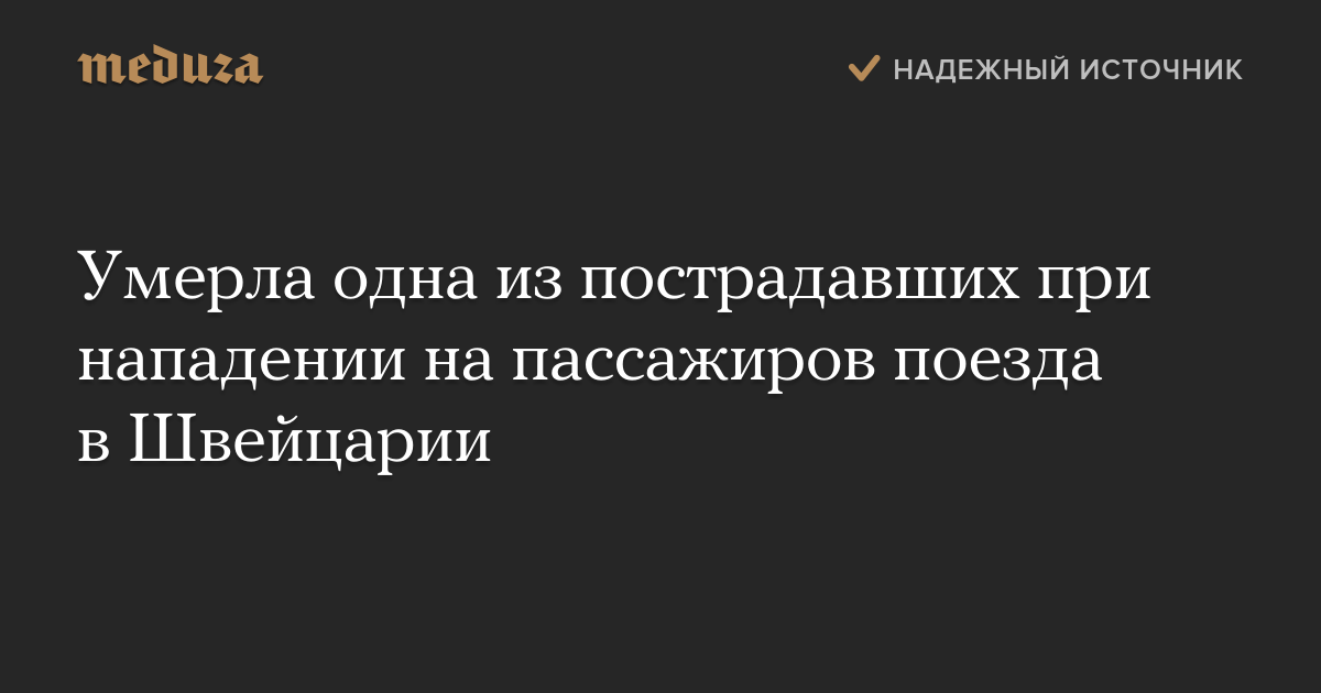 В Швейцарии скончалась 34-летняя женщина, раненная в результате нападения на пассажиров поезда 13 августа. Как сообщает «Би-би-си», также умер сам нападавший, который был госпитализирован с ожогами.