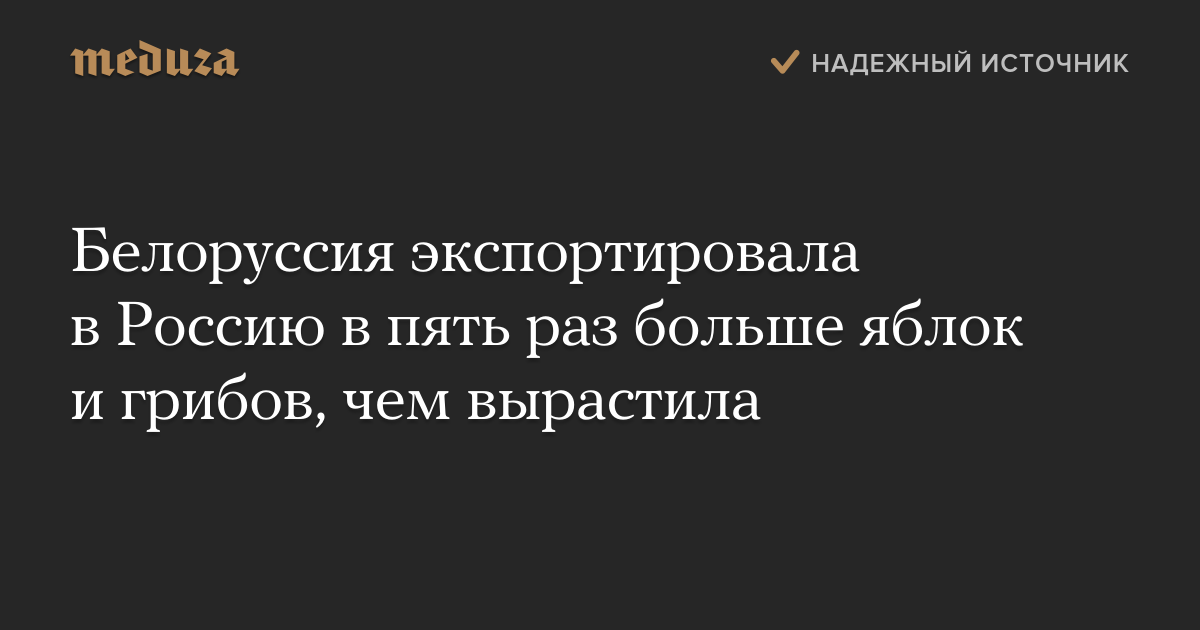 Заместитель генерального прокурора России Владимир Малиновский рассказал, что Белоруссия в 2015 году экспортировала в Россию 573 тысячи тонн яблок и грибов. Это в пять раз больше, чем собранный в стране урожай, заявил Малиновский, сославшись на данные Минсельхоза Белоруссии.