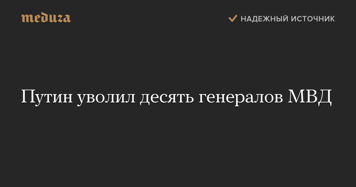 Президент РФ Владимир Путин подписал указ об освобождении от занимаемых должностей 10 генералов МВД. Документ опубликован на официальном интернет-портале правовой информации.