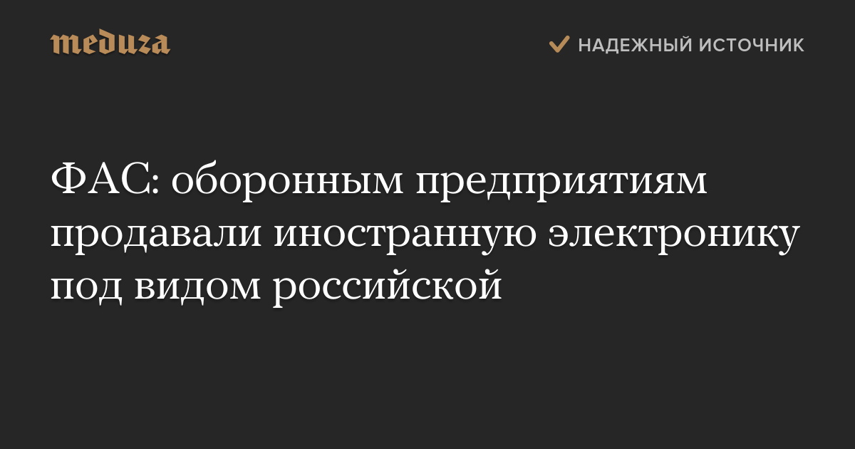 Федеральная антимонопольная служба (ФАС) обнаружила случаи, когда российские компании продавали оборонным предприятиям иностранную радиоэлектронику под видом отечественной.