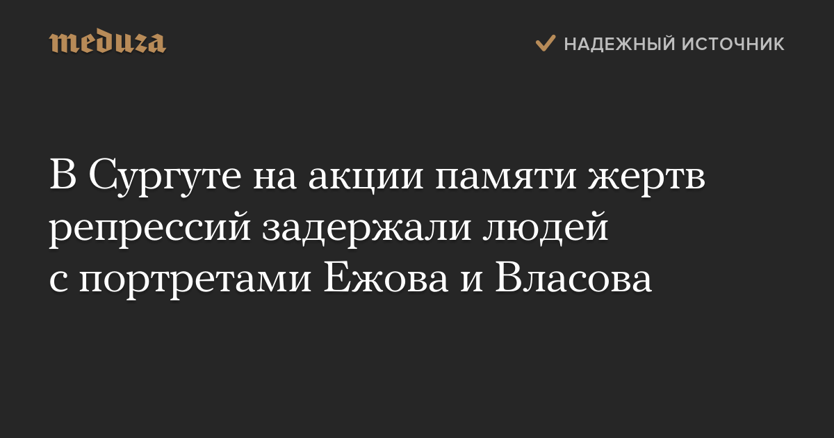 В Сургуте на мероприятии, посвященном Дню памяти жертв политических репрессий, были задержаны активисты с портретами главы НКВД Николая Ежова и сотрудничавшего с нацистами генерала Андрея Власова, подписанными словами «жертвы сталинских репрессий». Об этом сообщает Znak.com со ссылкой на своего корреспондента.