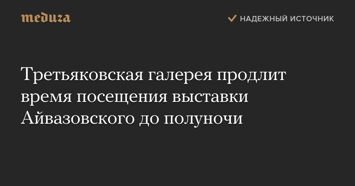 Время посещения выставки «Иван Айвазовский. К 200-летию со дня рождения» в Третьяковской галерее с 17 по 20 ноября — в последние четыре дня работы экспозиции — будет продлено до полуночи.