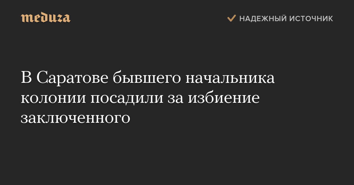 Что это за сообщение и почему оно повсюду на «Медузе»?Ленинский районный суд Саратова приговорил к четырем годам колонии общего режима бывшего начальника исправительной колонии № 10 Вадима Долгова, который обвинялся в превышении должностных полномочий за приказ избить заключенного. Как пишет издание FreeNews-Volga, обвинение требовало приговорить Долгова к восьми годам лишения свободы.
