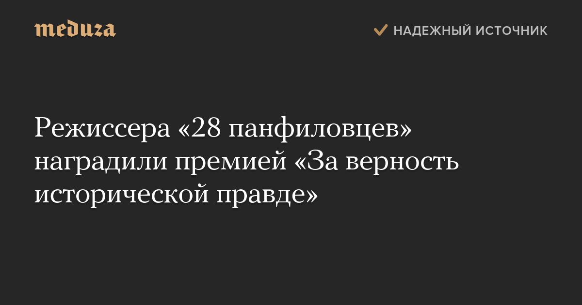 Режиссер фильма «28 панфиловцев» Андрей Шальопа получил премию «За верность исторической правде», которую вручает Российское военно-историческое общество (РВИО). Председателем общества является министр культуры РФ Владимир Мединский.