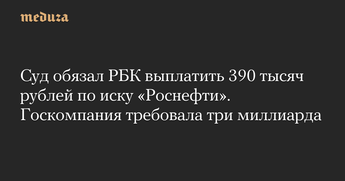 Арбитражный суд Москвы обязал медиахолдинг РБК выплатить 390 тысяч рублей по иску госкомпании «Роснефть» в качестве компенсации за ущерб репутации. РБК также обязано удалить публикацию о «Роснефти» и опубликовать опровержение. Об этом сообщает корреспондент «Медузы» из зала суда.