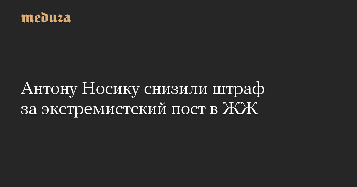 Мосгорсуд снизил штраф Антону Носику, который обвинялся в публикации экстремистского поста в «Живом журнале». Вместо 500 тысяч рублей его обязали выплатить 300 тысяч. Приговор вступил в законную силу.
