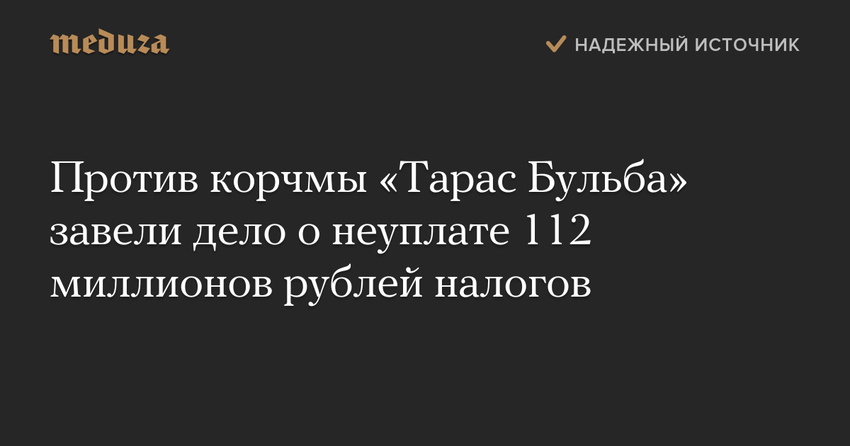 Следственный комитет РФ возбудил дело об уклонении от уплаты налогов в особо крупном размере против одного из ресторанов сети «Корчма „Тарас Бульба“». По данным ведомства, с 2011 по 2014 годы руководство ООО «Престиж» отражало в декларациях не все доходы и в результате бюджет недополучил 112 миллионов рублей.